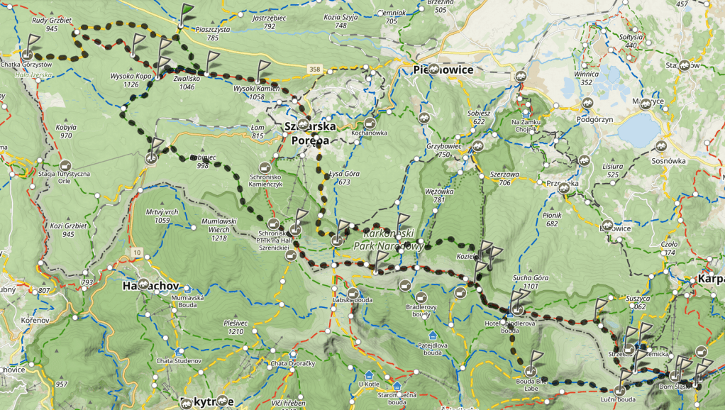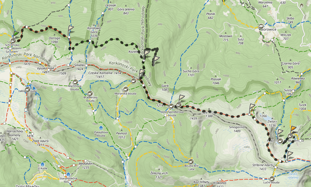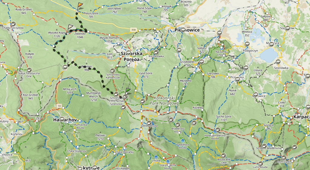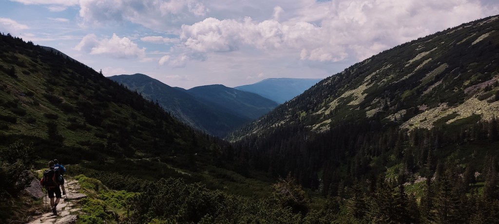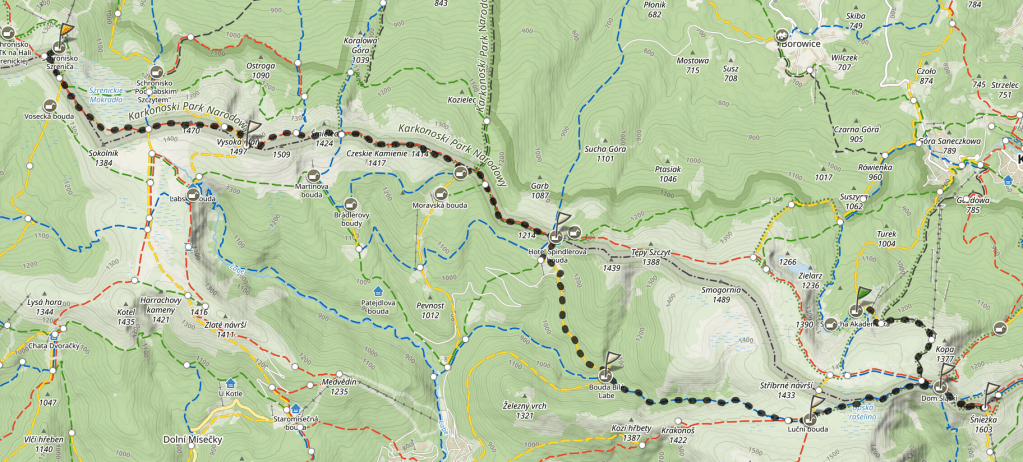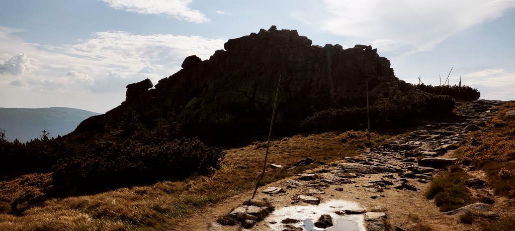 W Domu Śląskim zrobiłam chwilę postoju na „drugie śniadanie”, zameldowałam się troskliwym kolegom z poprzedniego wieczora i ruszyłam na Czechy. Chciałam sobie zejść trochę z gór mało uczęszczanym szlakiem, po czym wrócić na polską stronę na grani w okolicy, znanego już, Odrodzenia.