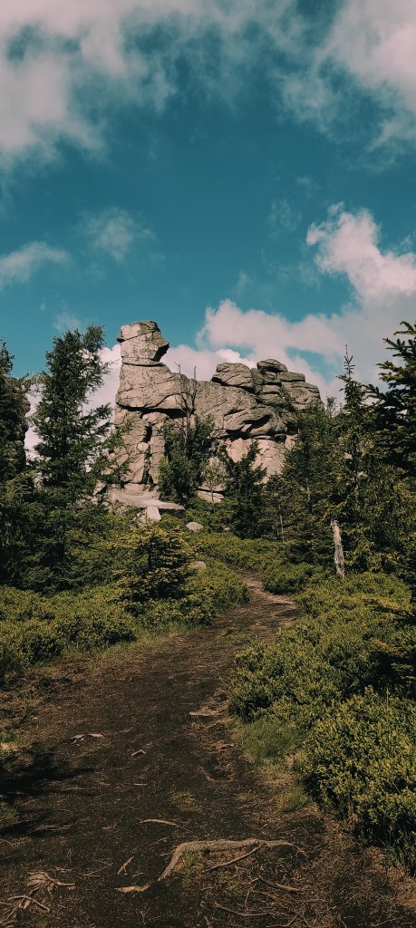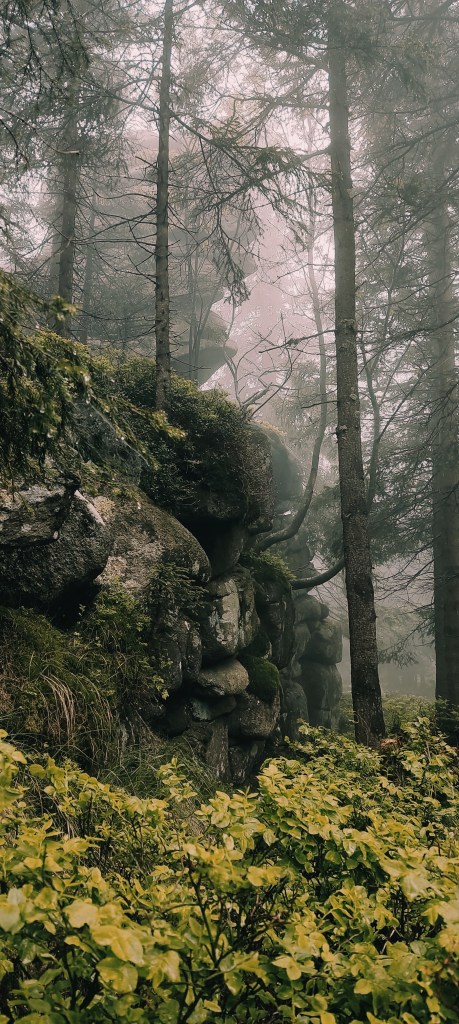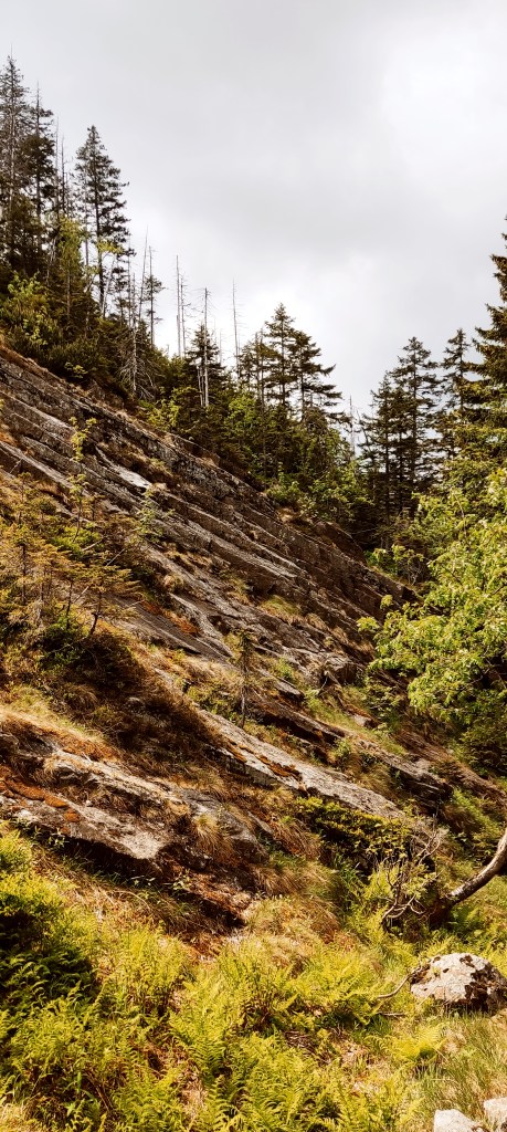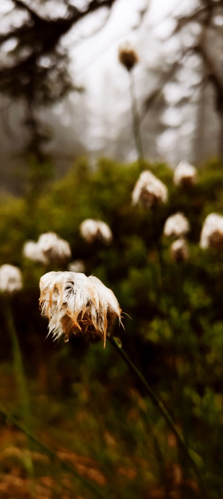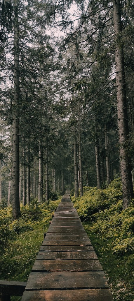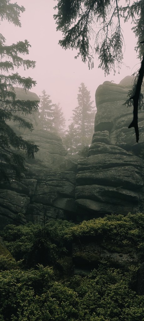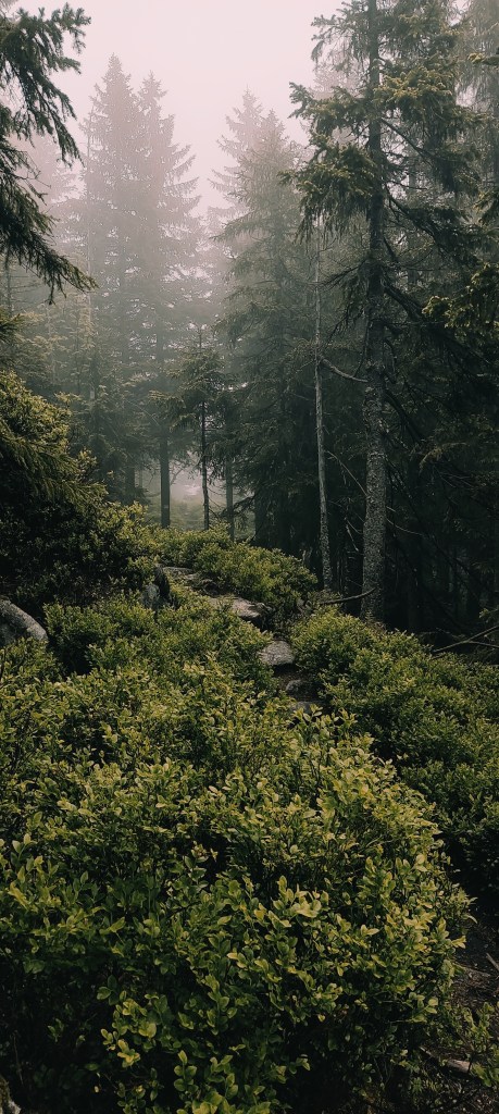 No piękne skałki, piękne. Nie powiem, że nie. Wyobraźcie sobie tylko na momencik tę ścieżkę. Namalujcie sobie w głowie obraz przeprawy przez torfowiska nieskalane od dawna ludzką stopą… Zaraz. Torfowiska? Czy ciebie, Ewa, pogrzało? Ano właśnie, tu mnie macie. Od kilku godzin lało, a ja sobie hyc, hyc, po torfowiskach, niczym jakaś sarenka. Chyba sarenka z horroru! No zapadłam się, co tu dużo mówić, w wodę. Nie dość, żeby mnie uznać za wariatkę zagrażającą własnemu życiu. Ale dość, żeby w moich butach powstały bajorka. Brawo ja!