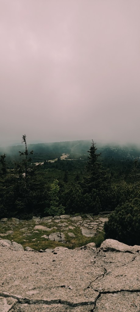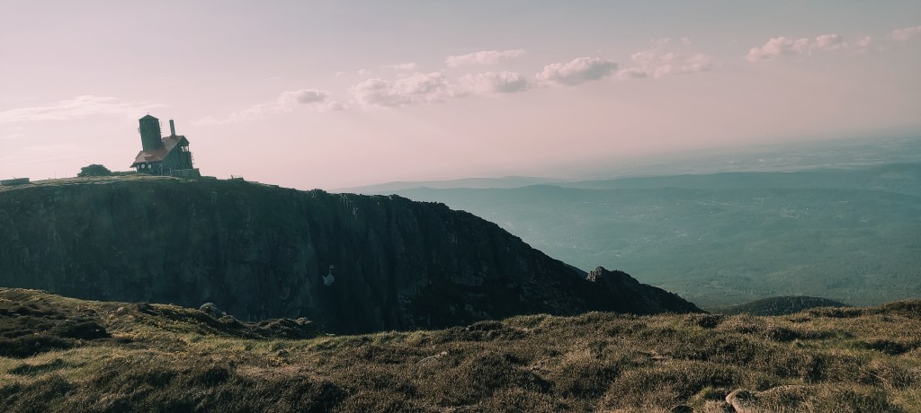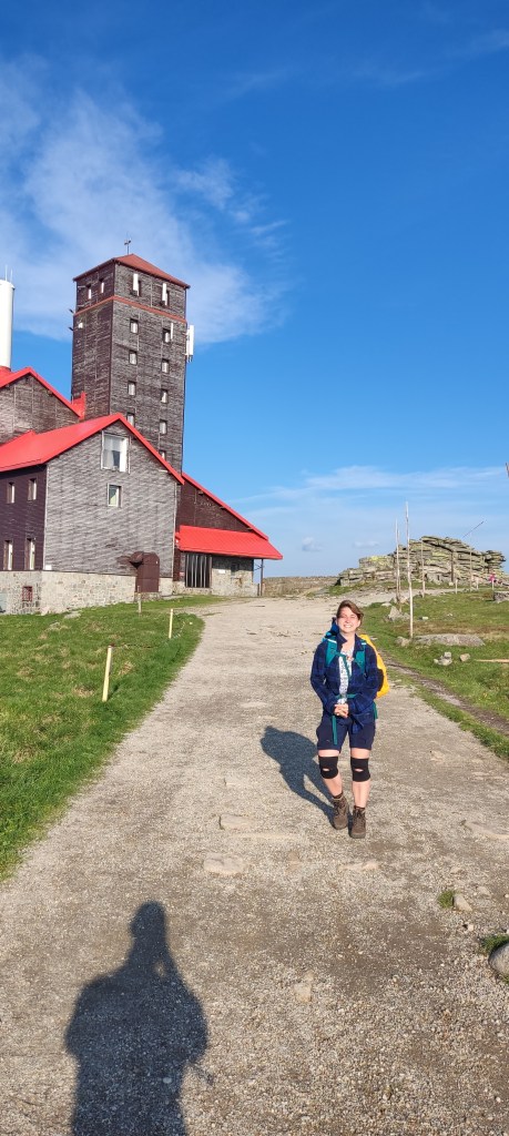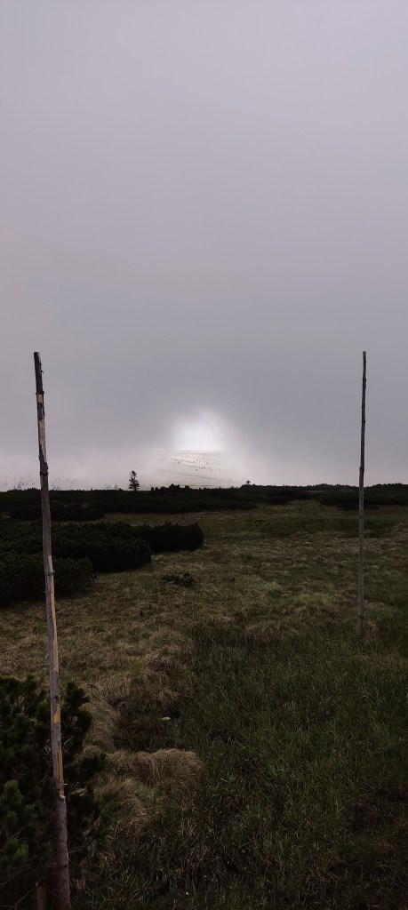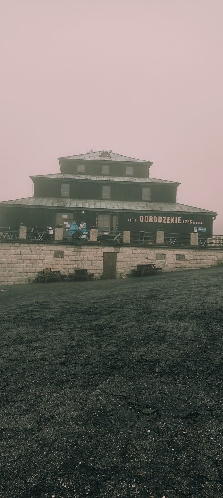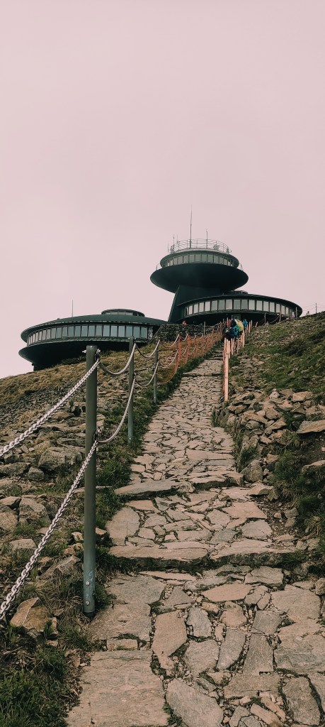Jak pogoda na Śnieżce? Z moich doświadczeń wynika, że da się inaczej (chociaż słyszałam plotki, że nie), niemniej trafiłam na full wiatr i mgłę. Byle złapać foto i pieczątkę i uciekać, please.