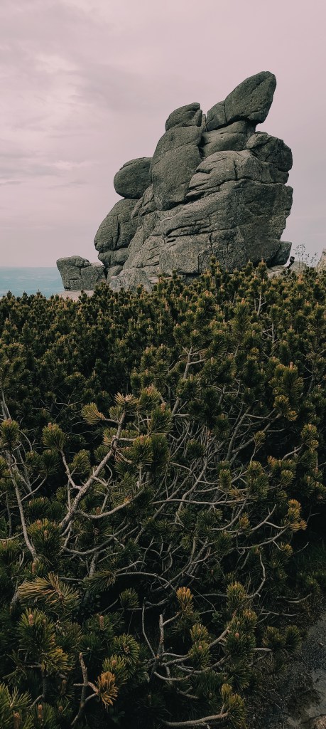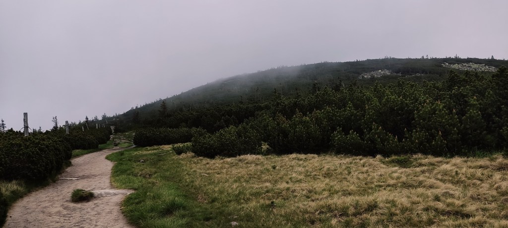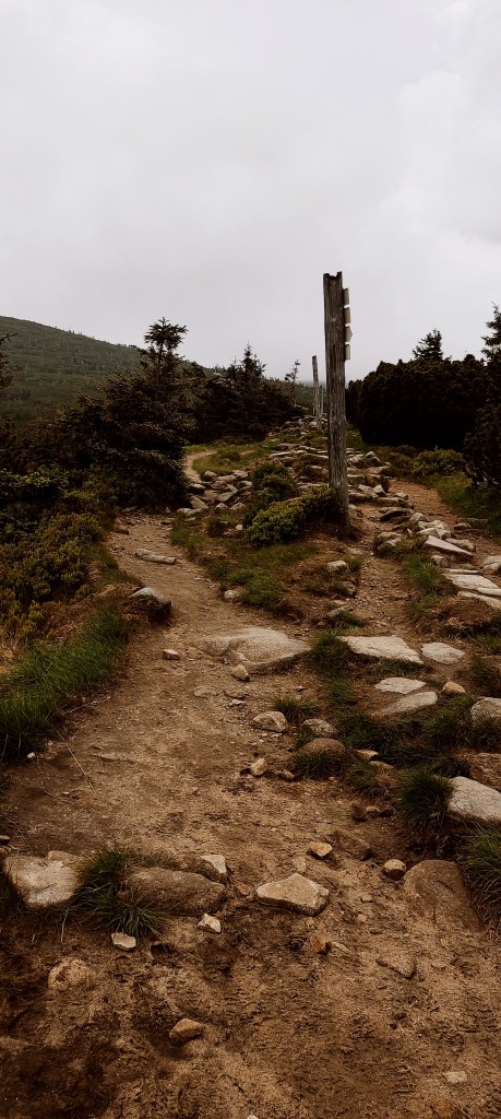 Jakimś cudem już nie padało i nawet zapowiadało się jakieś drobne rozpogodzenie. Dalsza trasa prowadziła granią, planowałam zejść za Słonecznikiem, przejść dołem koło Wielkiego i Małego Stawu i dotrzeć na nocleg na glebie w Samotni. Planowałam. Wyszło inaczej 😀