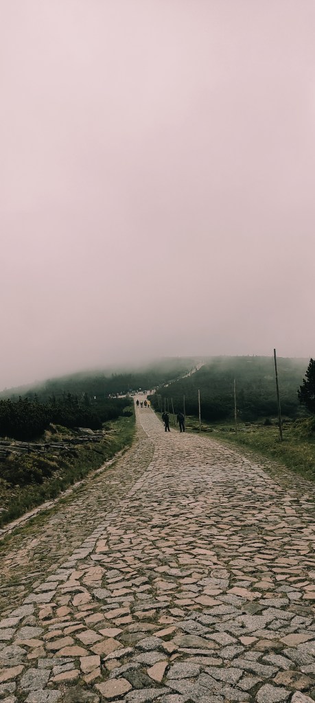 Po śniadaniu z piwkiem (klina klinem?) i wielu apelach, żebym została w ekipie na kolejny dzień, w końcu wyrwałam się spod uroku tej zacnej kampanii i ruszyłam na Śnieżkę. Pierwszy kawałek drogi również pokonałam w męskim towarzystwie (chociaż tym razem w innej grupie), jednak niebawem zostałam ponownie sama ze sobą. Mój wskaźnik socjalizacji zasadniczo całkiem się ucieszył i ładowałam sobie bateryjki, maszerując zawzięcie na szczyt.