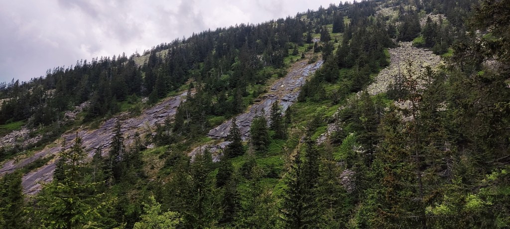 Niedługo później zaczęła się mżawka. Po mżawce przyszła ulewa. Mrau… Nie boję się zmoknąć, kluczowe było zabezpieczenie plecaka, ale przyznam, że przez tyle czasu w deszczu ciężko się wędruje. A jeszcze śliskie kamienie zmuszają do dość wolnego tempa. Dodam, że ambitnie wystartowałam w okularach i po chwili nic nie widziałam, a absolutny brak wiaty oznaczał dla mnie tyle, że wymieniałam je na soczewki pod drzewem, które wcale nie chroniło (ale udawajmy, że tak :D). Ostatecznie całość nie byłaby taka tragiczna, bo zrobiłam sobie przezornie herbatkę na drogę, miałam jeszcze kanapkę i jakoś się szło, ale…